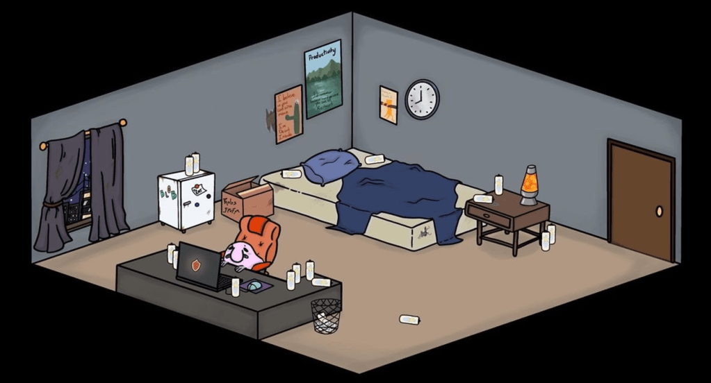 We Are Blob is a 2D game based on choices and clicks on objects in the scenario by Black Banshee Studios. As Blob, the player must survive a week of excessive work in game development, considering mental and physical health as well as social life.